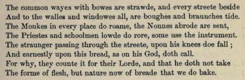 The exact nature of these plays and pageants remain shrouded in a food deal of obscurity. They have frequently been held up to ridicule; and many are the lampoons, rather unmerited, that have been made upon them. These lampoons, however, have served a very useful purpose. They supply us with interesting material as to the character of the plays which would not otherwise be in existence. Take for instance the following quotation from the "Popish Kingdom" describing the ceremonies of Corpus Christi day in Coventry:--
