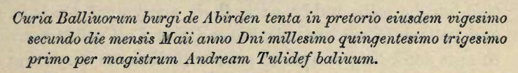 13th May, 1440—Curia Gilde tenta per prepositum in pretorio Burgi de Abirdene xiij die mensis Maij Anno Domino millesimo quadringentesimo et xlmo. Item, eodem die, per commune consilium concessus fuit Ricardo Kintor, tune Abbati de Boneacord, vnus burgensis futurus faciendus, ad libitum suum quandocunque ipsum presentauerit pro expensis suis factis et faciendis in quodam ludo de ly Ilaliblude ludendo apud ly Wyndmylhill.