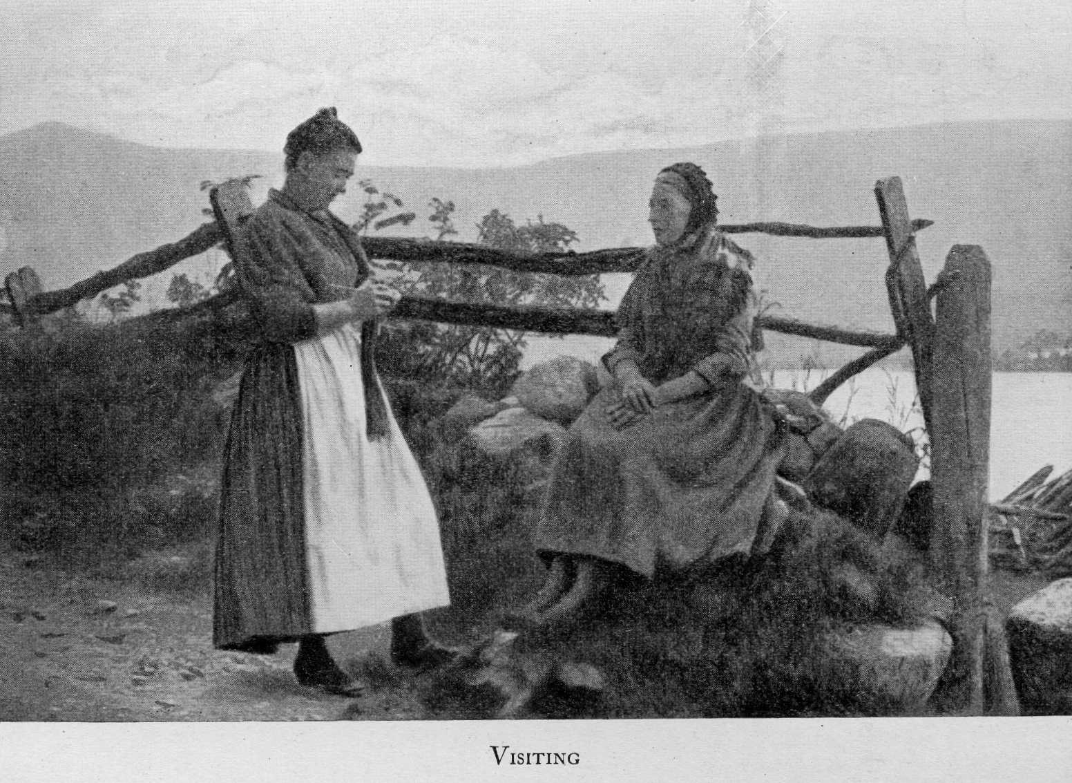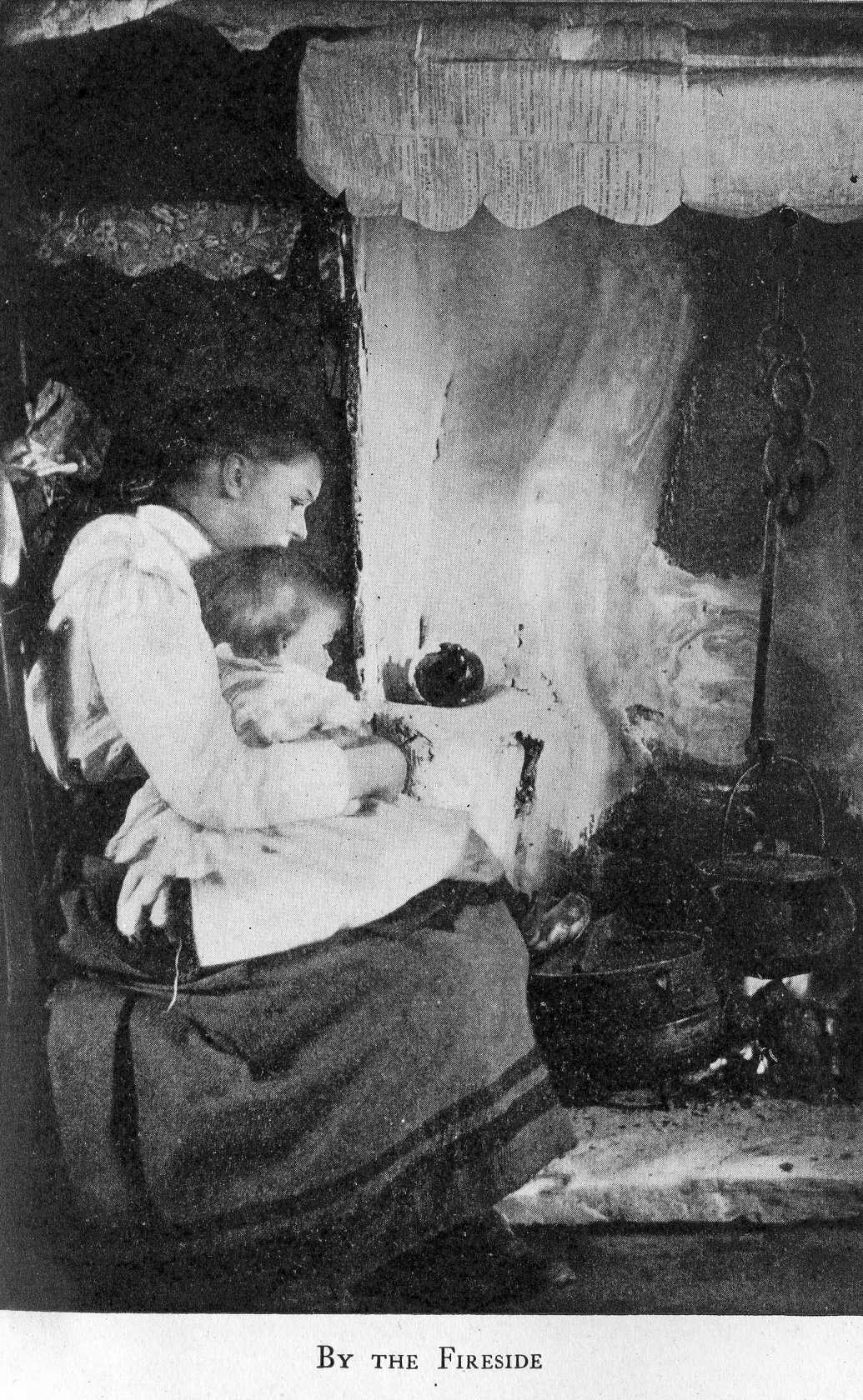 On the grass, near one of the houses, lay an old man taking care of a baby, and talking with a rosy-cheeked young woman who was standing in a neighboring doorway. I had hitched my horse and had been walking through the village, but now I stopped to converse with this group, and before I left was invited to step inside the dwelling. It had no second story, nor even a " loft," and the living rooms were only two, unless a third apartment, reserved for the cow, is counted. To keep the warmth from escaping, the low-raftered kitchen ceiling was pasted all over with many thicknesses of newspapers. Underfoot was a paving of great flat stones, with wide cracks and uncertain hollows between. In a pocket of the wall was a bunch of a bed, and conspicuous among the other scanty furnishings was a rack of crockery, with the kist (chest) containing the family supply of oatmeal beneath it. At one side of the room was a fireplace made of heavy stones, piled up so as to leave a depression in their midst, and the smoke went up a rude chimney of clay-daubed slabs hooding out from the wall. The wide chimney orifice began about four feet above the hearth, and when I put my head under and looked upward, I could see a bit of sky through the haze of smoke. That the wind and rain must have driven down freely at times was very apparent.