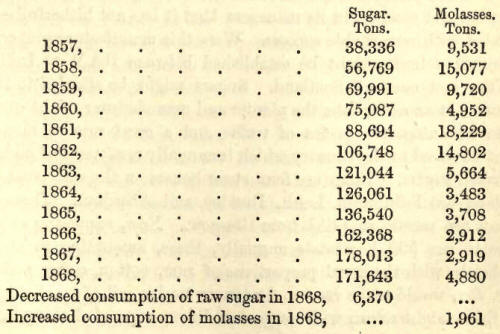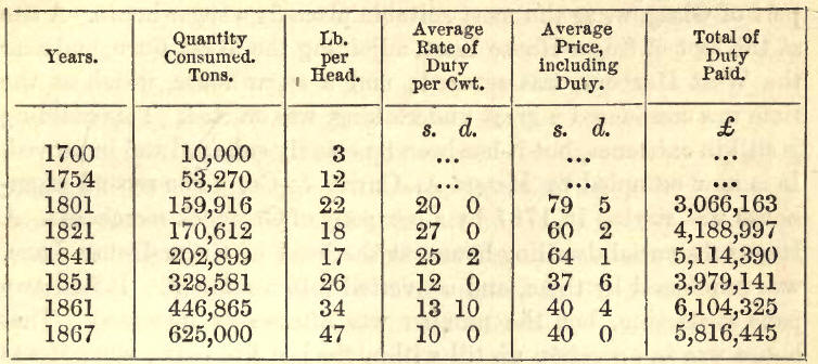 The quantity of sugar consumed in Britain in the year 1700 was only 10,000 tons, while in 1868 it was nearly 700,000 tons. The following table, though not quite perfect, shows correctly enough for general readers the quantity consumed in various years, the number of pounds per head of the population, the price per cwt. including duty, and the amount of duty paid on all descriptions of sugar:—
