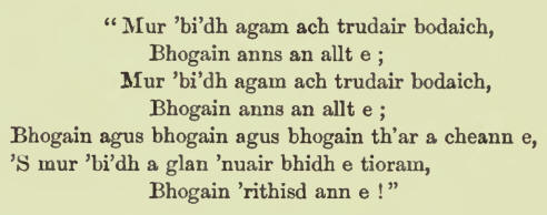 A finer winter [January 1871] never was known all over the West Highlands and Hebrides. Some tempestuousness is to be looked for at this season, and some tempestuousness we have had, but of actual winter rigour and cold we have hardly had a trace. Only twice during the winter have we had any frost, and even then it was but slight and of short duration. On several occasions, however, we have had such terrible rainfalls as are only known perhaps within sight of the mountain peaks of Jura and Mull and Morven. On the 19th of January, and again on the 23d, the rainfall within a given time was heavier than anything known even with us for many years past. In about sixteen hours on the 19th, 4.19 inches fell, and quite as much, if not more, on the 23d. Now, does the reader know what an inch of rain means? It means a gallon of water spread evenly over a surface of something like two square feet, or, to put it in a more striking and intelligible form, it means a fall of a hundred tons upon an acre of land ; so that in sixteen hours on the 19th upwards of four hundred tons of rain fell on every acre of land for miles and miles around us. It will be confessed that thus the country was for once at least well soaked and saturated. All our rivers and mountain torrents were, of course, in full flood, and throughout the night, when it had calmed down a little, the "noise of many waters," as you lay awake on your pillow and listened, made wild and eerie music enough, to which the fitting bass was the boom of the storm-driven rollers as they broke in sullen thunder along the shore. We had occasion to be across Corran Ferry on the wettest of these days, bad as it was, and, in spite of waterproofs and haps of most approved texture and form, we returned in the evening so soaked and drenched and droulrit, to use an expressive Scotticism, that we might as well have been for half an hour up to our chin, over head and ears for that matter of it, in the deepest pool of the Rhi. "When changing our clothes in our own room after getting home, we managed to raise a quiet laugh with ourselves over it all, by the recollection of the music and words of a favourite Scotch reel not altogether inapplicable to our then condition. The reel in question is a well-known one, though we forget at present its proper distinctive name. It is, Ave think, one of Neil Gow's. A gudewife, presumably of Amazonian heart, and also of Amazonian proportions, makes her husband Avince and quail, and conduct himself with becoming amiability and decorum, as she sings—