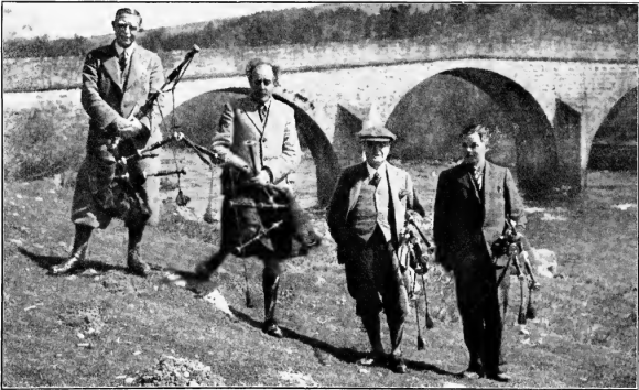 A day’s piping on the bank of the Shin River. Those in the group are Mr Angus Macpherson, the author; Mr Seton Gordon, Pipe-Major John Macdonald, Inverness, and Mr Malcolm Macpherson, the author’s son.