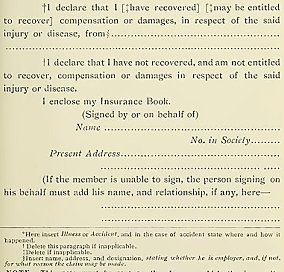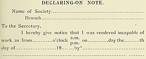 He must make a formal claim in writing on a Declaring-on-Form, which the Secretary or Agent of his Society will give him. This form must be carefully filled up and handed in together with a medical certificate obtained from his doctor. The form of Declaring--on Note will usually be something- like the following :—