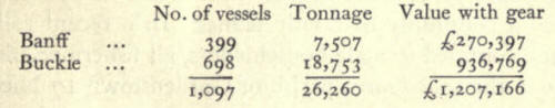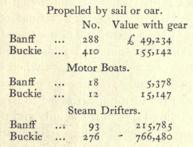 The story of progress in the present century reads indeed like a fairy tale. Thus in 1900 the Banff Fishery district had no steam vessel; the Buckie district had three, the value of which, with their gear, was put at £8094. Fourteen years later the number of steam drifters in the county had increased to 398 and their value was put at over one million sterling. At the same time sailing boats decreased in value and in number: in 1900 there were in the Banff district 463 and in the Buckie district 731, figures that nine years later fell to 372 and 443. Since that time the same tendency has increased; and if the prophecy of a Portknockie fisherman may not prove true that the sail boat here may become as much a thing of the past as Caesar's galleys, the trend of the industry is certainly all in that direction. In the meantime the process has been held somewhat in check by the installation in a number of the zulu boats of motor engines and by the provision of other new craft similarly fitted. These vessels, as occasion demands, may use either the wind or the motor. In the year 1913, the year preceding the outbreak of war, when matters were normal, fishing resources in the county were: