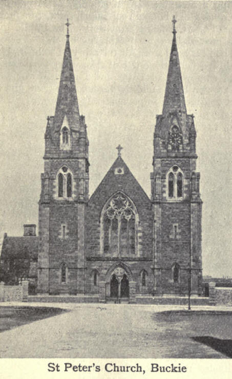 Buckie (8897), the earliest fishing station in Rathven parish, is the largest town in Banffshire and has more line fishermen than any other town in Scotland. It consists of three main divisions: Buckpool, Easter Buckie and Portessie. Buckie, Buckpool, Ianstown and Gordonsburgh were erected a burgh in 1888 and Portessie was incorporated in it in 19o3. The activities of the town centre largely round the harbour, which was opened in 1879 and which, with later additions, cost the Cluny Trustees,C8o,000 when it was purchased by the Town Council, under whose management it has been greatly extended at a heavy expenditure. The Buckie fishermen own a magnificent fleet of fishing craft whose influence is felt wherever they operate round the British Isles. The graceful twin spires of St Peter's Church, rising to a height of 115 feet, form a notable feature of the local architecture.