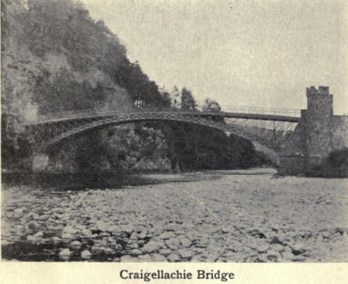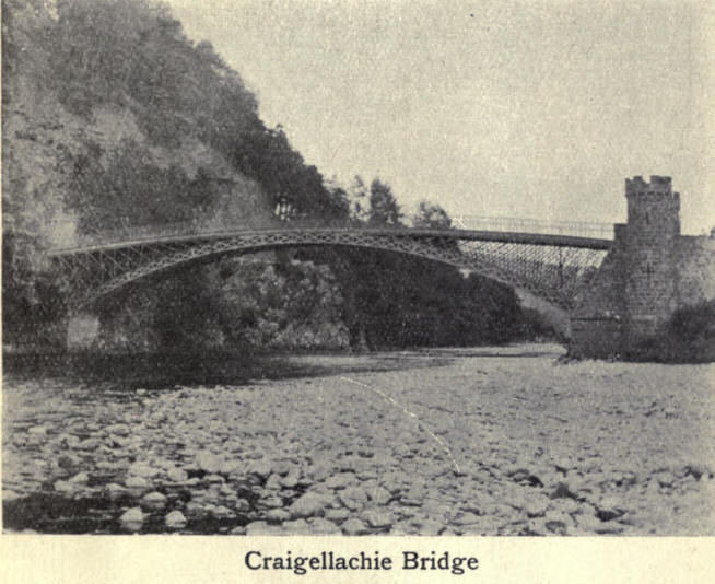 Craigellachie is the railway junction of the main line Aberdeen to Elgin and the Strathspey line to Perth via Boat of Garten. It is beautifully situated near where the waters of the Fiddich reach the Spey and is very popular as a summer resort. One of the most beautiful bridges in the county is that over the Spey. The cast-metal arch and framing, so light and airy in appearance, the embattled towers which flank the abutments, the rugged and precipitous rocks overhanging the river and the roadway, the dark deep pool below, the finely wooded eminence in the background, and the picturesque accessories which enhance the prospect on all sides, combine to render Craigellachie Bridge a picture of no ordinary beauty and charm. It was erected in 1815 by Mr Simpson of Shrewsbury, after a design by Telford, and withstood the floods of 1829, when the water here rose to the height of 15 feet above the ordinary level. The arch is 150 feet span, and the turrets rise to so feet.