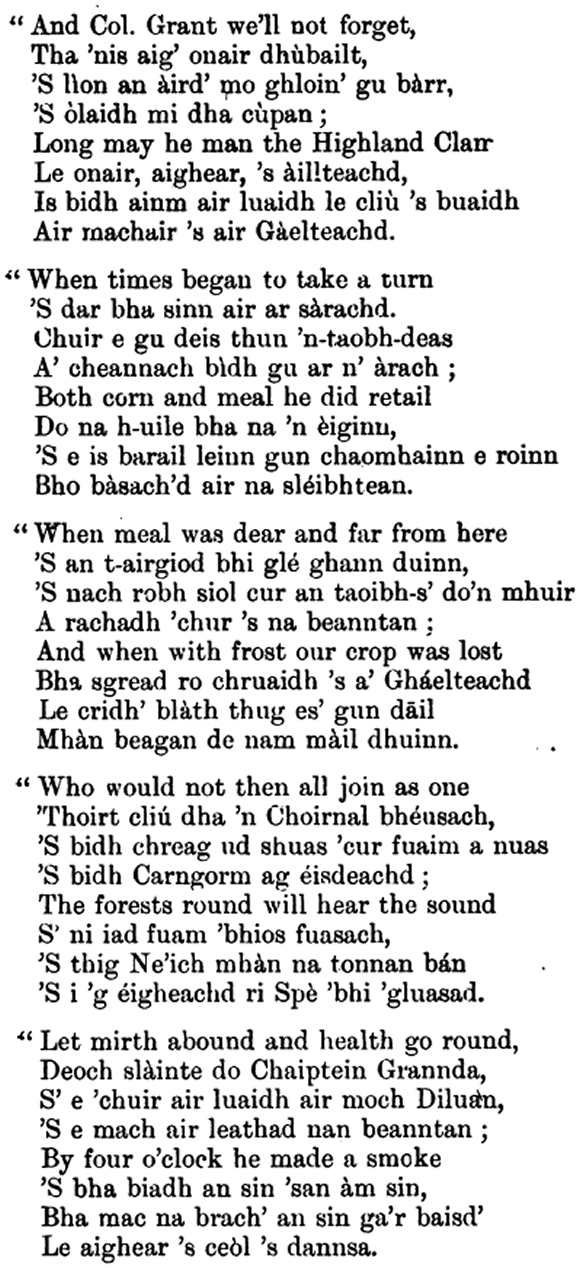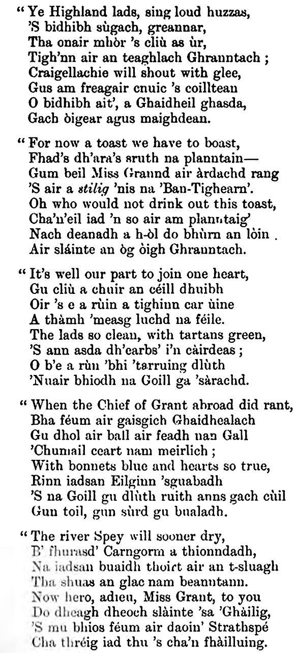 In pleasing contrast to the common place sentiments of the Lowland bards on the raid, take the following Strathspey song, full of Celtic fire and fervour, and for many years popular round the ceilidh fire in that district. And yet there are indications in its quaint transitions and Saxon innovations that the old modes of thought and speech were beginning to crumble away :—