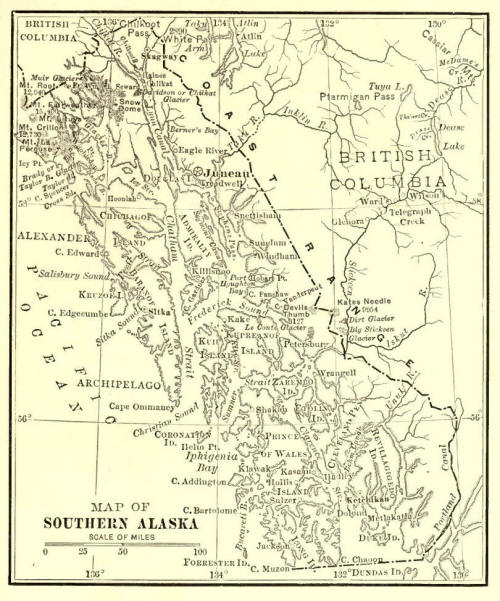 The next day was spent in cautiously picking a way across to the west side of the bay; and as the strangely scanty stock of provisions was already about done, and the ice-jam to the northward seemed impenetrable, the party decided to return to the main camp by a comparatively open, roundabout way to the southward, while with the canoe and a handful of food-scraps I pushed on northward. After a hard, anxious struggle, I reached the mouth of the Hugh Miller fiord about sundown, and tried to find a camp-spot on its steep, boulder-bound shore. But no landing-place where it seemed possible to drag the canoe above high-tide mark was discovered after examining a mile or more of this dreary, forbidding barrier, and as night was closing down, I decided to try to grope my way across the mouth of the fiord in the starlight to an open sandy spot on which I had camped in October, 1879, a distance of about three or four miles.