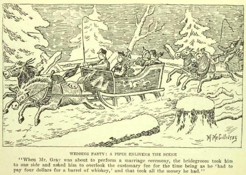 "But all were brothers then, and this greatly helped in making hardships endurable. If there was a barn to be erected, all assisted in its erection. When a wedding was to take place, the whole neighbourhood was invited. But the great social events of the settlement were the neighbourhood dances, which were held every week in winter, the neighbours taking turns in providing house room. The biggest room in the house was cleared, the great logs roared and crackled in the open fireplace, and flying feet kept time with the wild whirl of the music."