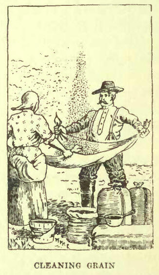 "Our first wheat was cleaned either by sifting it through a screen or placing it on a sheet and then shaking the sheet so as to throw the grain up in the air and allow the wind to carry off the chaff. When fanning-mills came in, they were taken from farm to farm as threshing outfits are now."