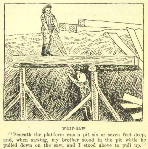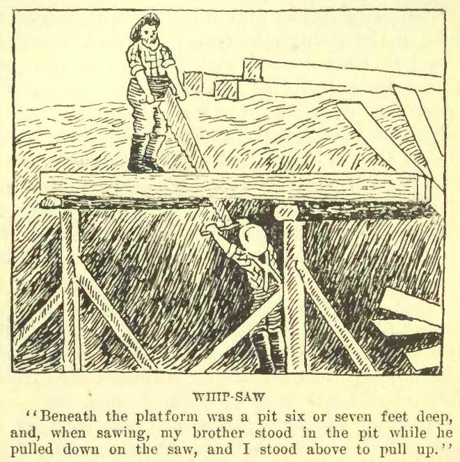 "We cut the planks for that craft with a whip-saw," the captain told me. "I bought the whip-saw in Goderich for five dollars and carried or trailed it all the way to Kincardine. A platform was built on the side of a bank and supported by posts. Beneath this platform was a pit six or seven feet deep, and, when sawing, my brother stood in the pit while lie pulled down on the saw, and I stood above to pull up. After finishing our boat, we cut all the boards for flooring, roof, gable ends, and windows for a house eighteen feet by twenty-four and got a yoke of nine-year-old oxen for our pay. It was a fair day's work to cut from two hundred and fifty to three hundred feet of lumber in a day with a whip-saw, but some days, when everything was running well, we got up to four hundred."