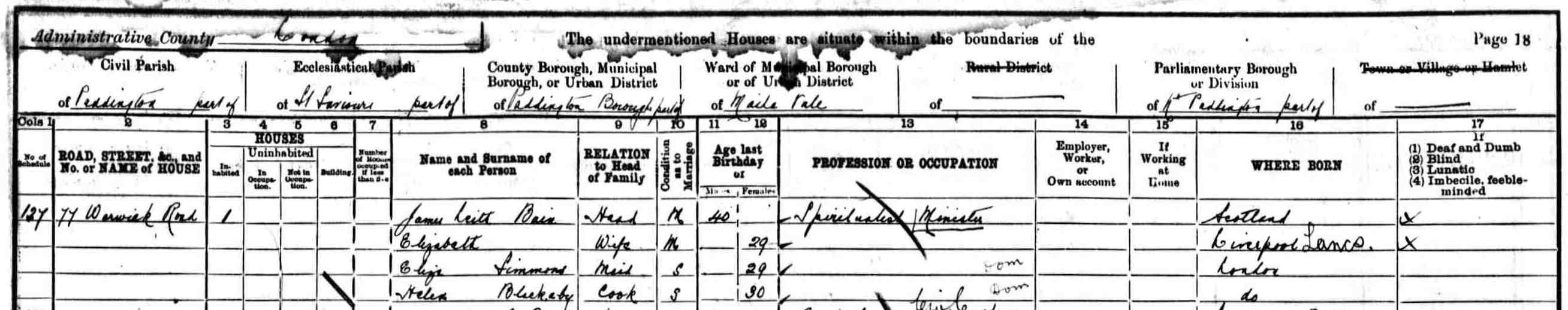Smith recalls that it was rumoured in Pitlochry that James had been 'adopted' by a 'lady of means' and eventually had inherited her wealth, but whether that rich lady was his wife Elizabeth (Lillie), or a benefactress of his bachelor days, is not known. At any rate the 1901 Census for 77 Warwick Road, Paddington, London indicates that the married couple were able to afford a maid and a cook!