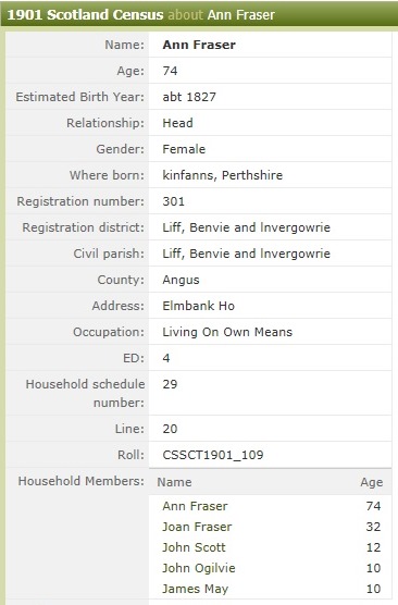 Widow Ann (Kinmont) Fraser is living on 'independent means' with her