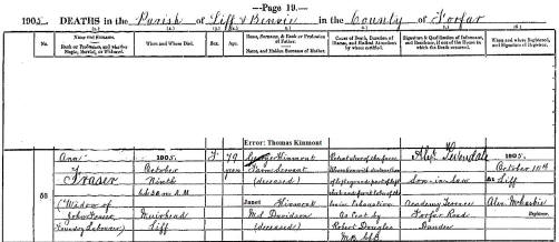 (Kinmont) Fraser dies aged 79 in Muirhead, Liff and Benvie, Forfarshire.
