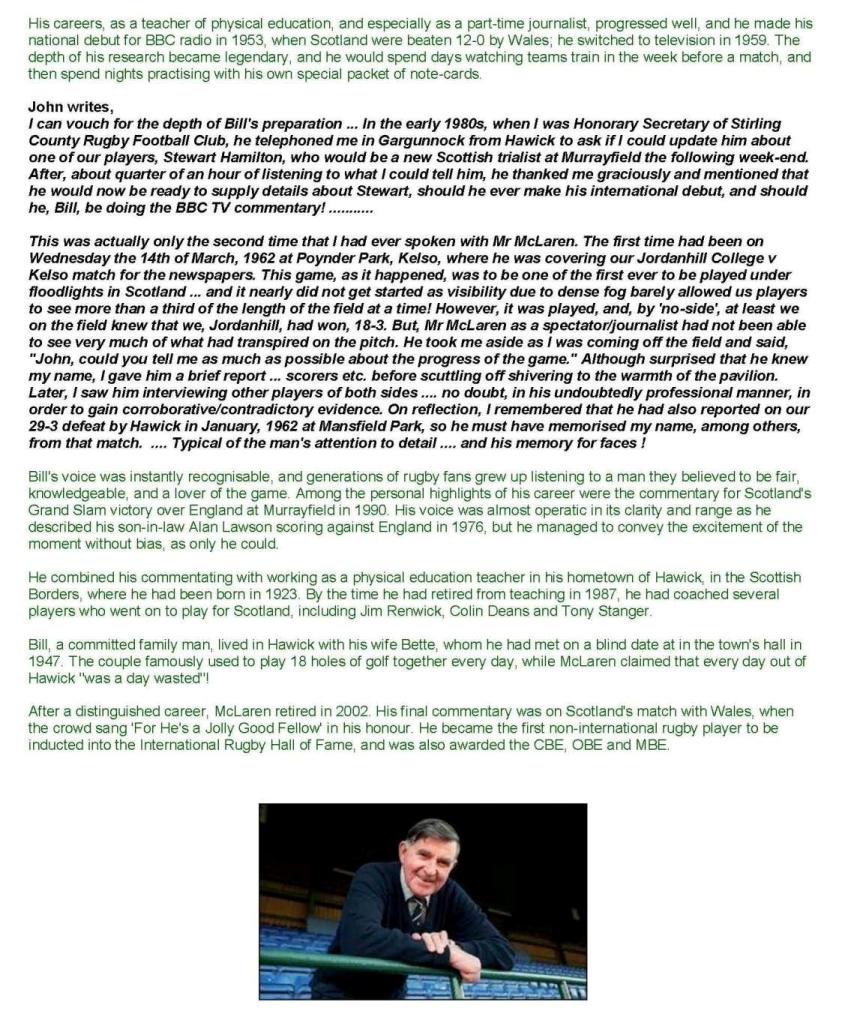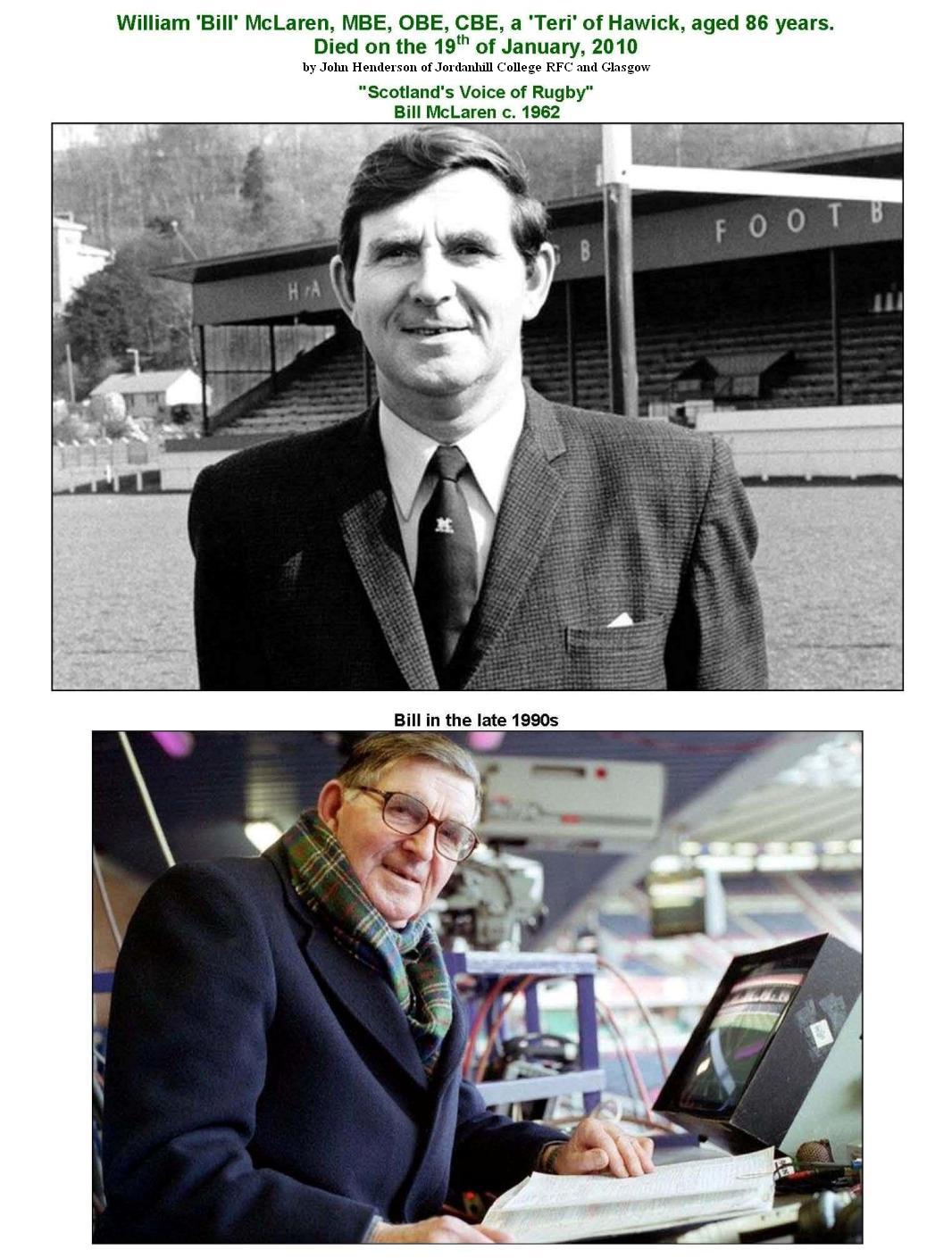 Bill McLaren, CBE, rugby union broadcaster, was born on October 16, 1923. He died on January 19, 2010, aged 86