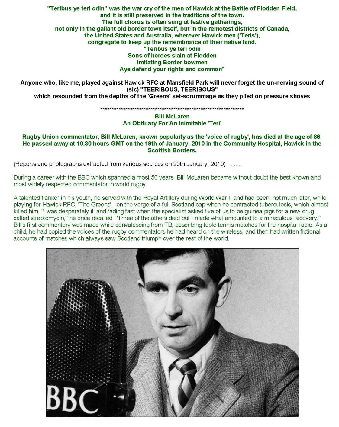 During his isolation McLaren began to forge his broadcasting career, having set up a putting green in the hospital grounds so that he could commentate on golfing competitions between patients for the hospital radio service. When he recovered he worked for three years as a reporter on the Hawick Express, all the while maintaining his strong interest in rugby. Unbeknown to him, a colleague with BBC connections wrote to a friend in London recommending McLaren’s services as a rugby commentator.