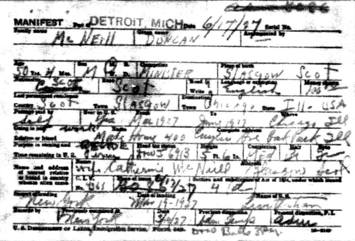 1927 on board the SS Leviathan from Glasgow. Thence Duncan in June, 1927 is