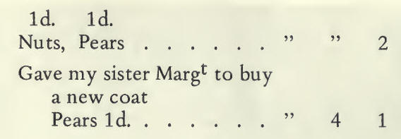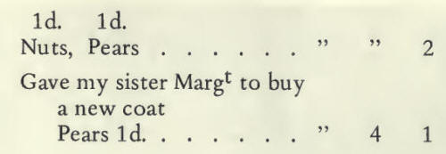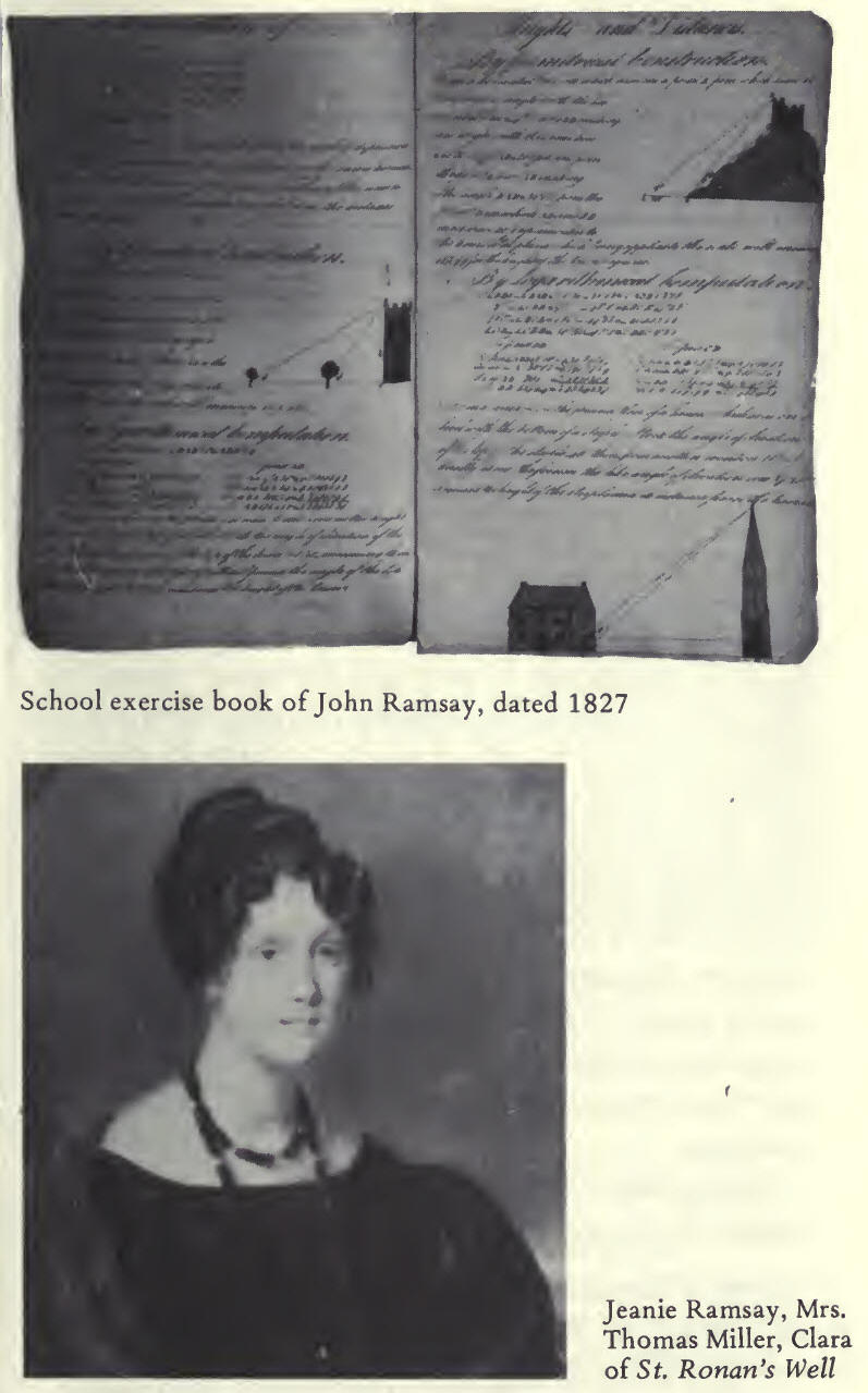 He paid Mr. Laidlaw "for teaching me Latin, 7/-" and quarterly subscriptions to the reading club and lending library of 1/1. Although he was careful, he was also generous and there are many entries of gifts to his sisters and "a ring for Aunt"; toys for his young cousins in Glasgow and for the children of his eldest sister Janet, Mrs. Pender, who lived in Falkirk. To visit her he travelled "by boat, 3/- (the Forth-Clyde Canal, sometimes getting a lift on to Alloa in the Earl of Mar's coach, for which he would tip the coachman a shilling. It cost 8/6 by mail coach to Edinburgh to visit another sister, Jeanie, Mrs. Miller (immortalized, says family tradition, by Sir Walter Scott as Clara in his "modern" novel St. Ronan's Well). His father "took a loan of 5s." on July 22, 1829, and in May the following year an entry reads "gave my father to buy clothes to take him to England, £1. 15. 0." and to a "poor soldier's widow to help her to go to America, 6d." while on January 30 he enjoyed himself at "a curling match played by candlelight" for the cost of 7d. He seems also to have done casual work as he records receiving "from Hospital £5." presumably for clerking or accounting.