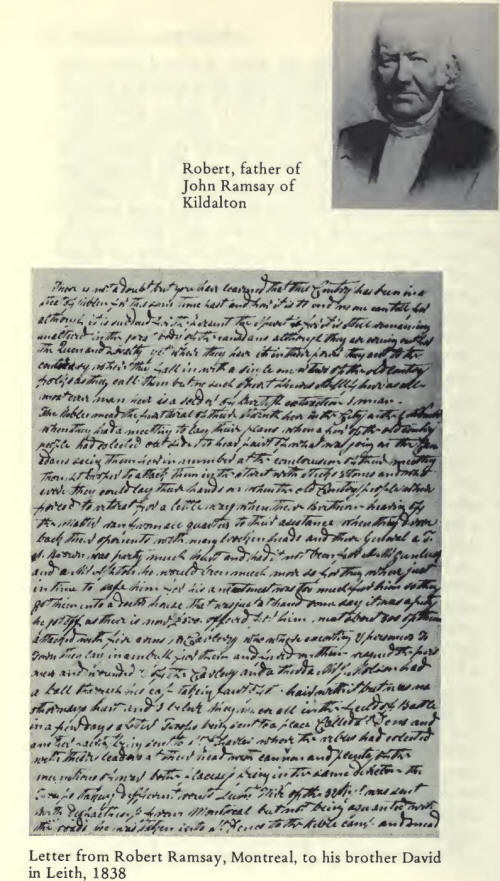Canada at this time, apart from the Maritime Provinces, was divided into Upper and Lower Canada. The latter had been settled by the French in the seventeenth century and, though surrendered to Britain, remained a religious and linguistic entity, deeply conscious of its origins and traditions; the former had been settled mainly by those of British blood who could not stomach republicanism and had cut their losses in the new United States, crossed the border and proceeded to carve out of the Ontario bush another colony for Britain. These two colonies, incompatible in many ways, together repelled the American invasion of 1812-14, but by the eighteen thirties differences had arisen between them. The French Canadian residents of Quebec resented the privileges and power enjoyed by the English-speaking minority in their province. When these English merchants and professional men promoted a bill which would unite the two provinces, giving greater representation to non-French areas and eliminating French as a language of government, there was an outcry against "les Anglais" and British immigrants found themselves unpopular. The residents of Upper Canada, though glad to have their land values raised by an influx of British immigrants, nevertheless resented the political viewpoint which they introduced and refused to acknowledge them as equals. "Old Country folk" were, therefore, personae non gratae for different reasons in both provinces, and provided a butt for the native-born in each, in two short, simultaneous, but quite separate and unsuccessful rebellions at the end of 1837. Robert, living at 63 St. Antoine Street, Montreal, wrote a graphic, breathless account to his brother David in Scotland.