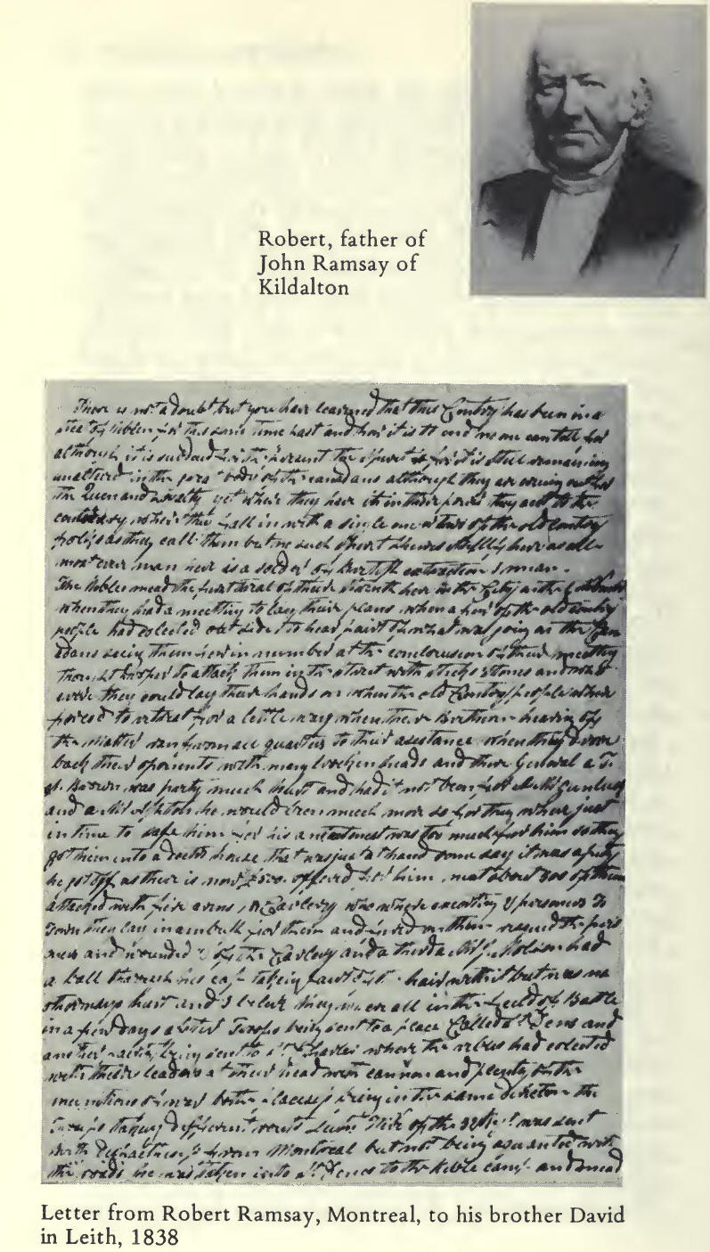 John Ramsay, the youngest son in a family of seven, was born on August 15, 1815, exactly two months after the Battle of Waterloo. To the end of his days he retained a vivid memory of watching, as a small child, from the windows of one of the tall Stirling houses, the last public hanging in Scotland. The victims, Baird and Hardie, belonged to a movement which bound its members by the "Glasgow Oath" to endeavour "to obtain either by moral or physical strength as the case may require for all persons, not disqualified by crimes or insanity, the elective franchise at the age of twenty-one". When they marched towards Edinburgh to dramatize their cause, armed with pikes and agricultural implements, they were arrested by the military, convicted of treason and sentenced to death. Admitting that the authorities were still fearful of the possible effects of the French Revolution, nonetheless the Ramsay family were staunch supporters of the Electoral Reform Bill which, twelve years later, was to be a fitting memorial to the unfortunate weavers. In after years, the impression made by this event fired John's interest in politics and he gave his youthful admiration to Sir Robert Peel, whose great statesmanship remained an inspiration throughout his life.