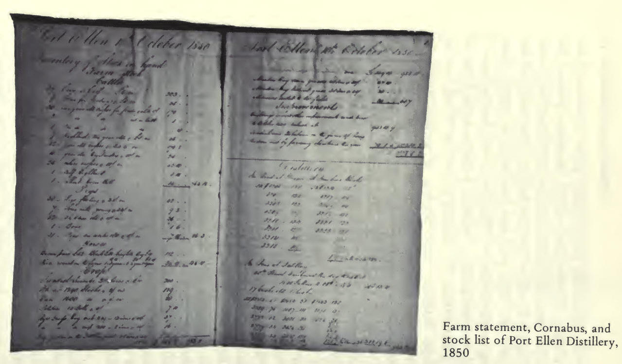 John was now twenty-five years old and the proprietor of his own business. From this time he and his distillery prospered. His sister Margaret came to keep house for him at Cornabus, which he slated and modernized. It was, in fact, the first house in Islay to have a water closet. So effective were his farming methods that James Johnston, a leading agriculturalist of the day, called the attention of the Islay tenants to Cornabus in a letter dated October 26, 1845, in which he pointed out that a large area of bogland on this farm had been very successfully drained. John was also the first to cultivate turnips in the parish. His farm statement at the end of ten years is of especial interest, being, as far as is known, the earl- jest detailed account of a modern farm in Islay. Generations of progressive farmers, Stirlings and Ramsays, in the Carse of Stirling, had bequeathed to him a deep love and an instinctive feeling for the land, and his early upbringing among them, added to his own intelligent observation, had shown him the methods best suited to its improvement. For many years he was to be a well-known contributor of articles on agricultural subjects to the Glasgow Herald, under the pseudonym of "Scottish Farmer".