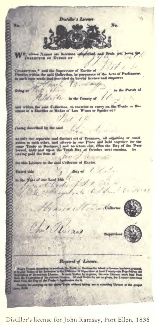 In 1840, Walter Frederick Campbell of Shawfield and Islay, also much impressed by John's integrity and ability, exercised his right of preemption at the expiry of the lease, following the death of Major Adair, and purchased the distillery for £1,950, which equalled the highest bona fide bid, made by Alexander Craig of Wadeston Mills, Glasgow. Reimbursed by John for this amount, Walter Frederick had a completely new lease made out in John's name; also a lease for the farms of Cornabus and Kilnaugh ton on the neck of land connecting the peninsula of the Oa to the mainland of Islay - a part of the lands granted to Brian Vicar MacKay by Donald, Lord of the Isles, in the Gaelic Charter of 1408, one of the treasures of the Register House, Edinburgh.