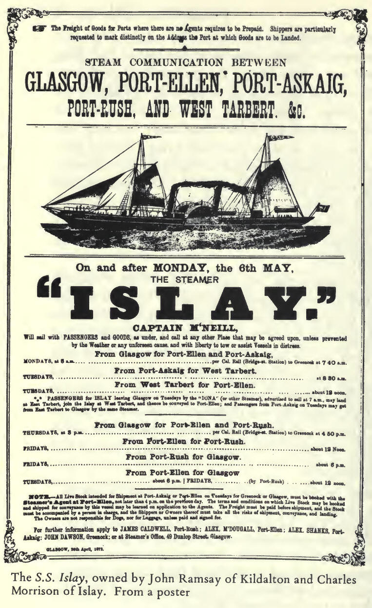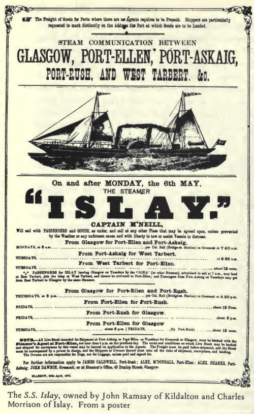 John's cargo boats went as far north as Stornoway and the business thrived, but in 1855 he withdrew from this northern trade and persuaded Charles Morrison, eldest son of James of Basildon, to become half-owner of the Islay, a steamer purchased by Walter Frederick Campbell for the benefit of the island, in which several distillers had a share, John Ramsay's being the largest. He then concentrated on a bi-weekly cargo and passenger service between Islay and Glasgow, including calls at Port Rush in Northern Ireland and West Loch Tarbert on the Argyll mainland.