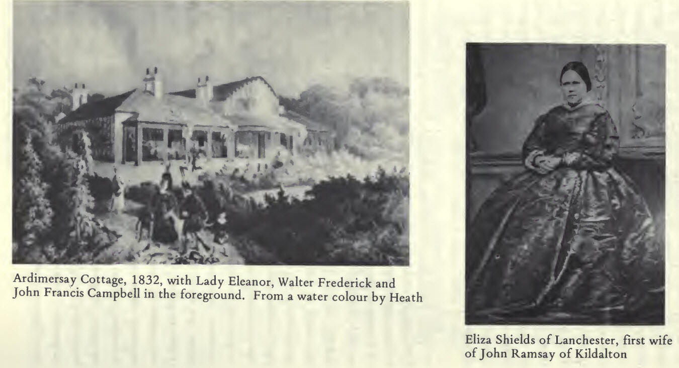 At the request of Mr. Campbell, his elder son, John Francis, (later to be famous as the editor of the Popular Tales of the West Highlands) and John Ramsay acted as his trustees throughout the period of the sequestration. James Brown, an Edinburgh accountant, was chosen commissionar for the creditors and for six years administered the estate, during which period there were a number of enforced evictions, especially from the lead mining district of Kilmeny. The Campbells retired to live in Avranches, in Normandy, but John Ramsay and his widowed sister, Mrs. Miller, immediately offered to adopt their younger son, Walter, and their third daughter, Violet, in order that the children might at least be brought up in their own country. Walter Frederick, however, declined the offer, saying that the children were now all that was left to his wife and himself and that they would strive to keep them. The whole family were forced to live in very meagre circumstances and Mr. Campbell died in 1855.