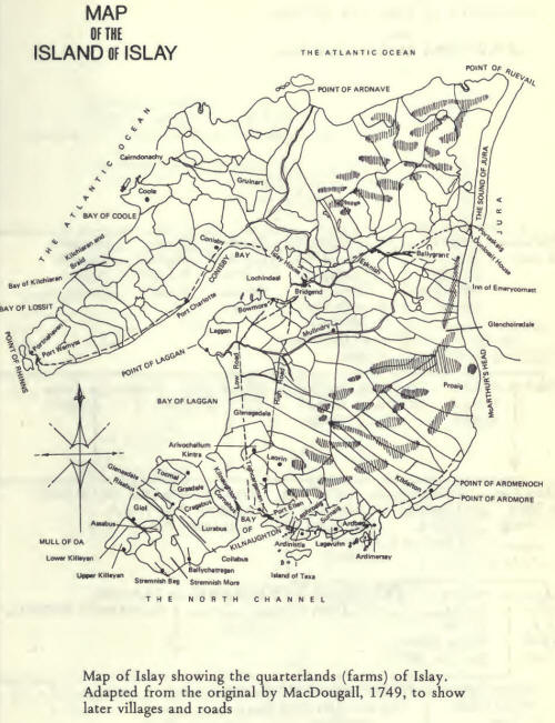 After the Rebellion of 1745, a steady stream of tacks- men's families, often accompanied by their subtenants, emigrated to the New World or joined the British or East India Company's armed forces. In 1738-39-40, over four hundred people left Islay for the New England colonies. Thus the static population of the island continued to be the crofters. The Shawfield plan was to elevate the more promising of these to the state of tenant farmers and to guide others into light industries, so that the burden of over population might be lifted from the arable land. At no time in their history had these crofters worked for wages, their time had been their own, and, because of the frequent absences of their superiors, they had come to look on the land as theirs. Though this gave them an independence of spirit, it certainly was not conducive to their acceptance of modern leases for fixed periods and stated rents, with provisions against subletting; nor did they favour regular work for wages in the various light industries which were introduced. They were, moreover, almost entirely Gaelic-speaking and largely uneducated, which made them slow to accept modern concepts of progress and contemporary thought. The result was that they remained on the land in greatly increasing numbers, subdividing it more and more as sons and grandsons grew up.