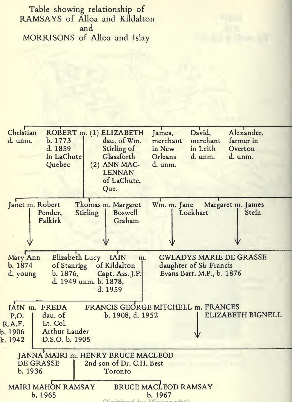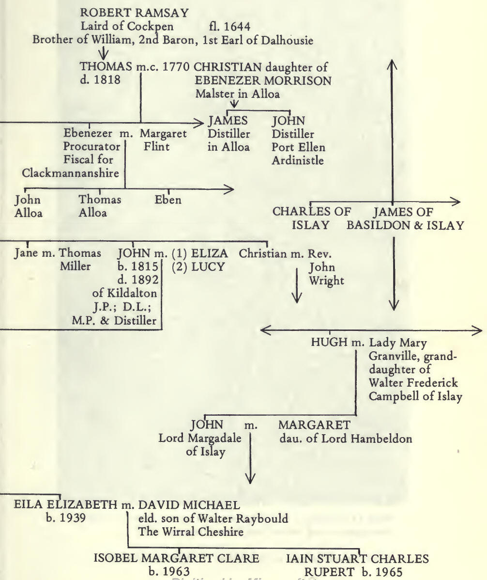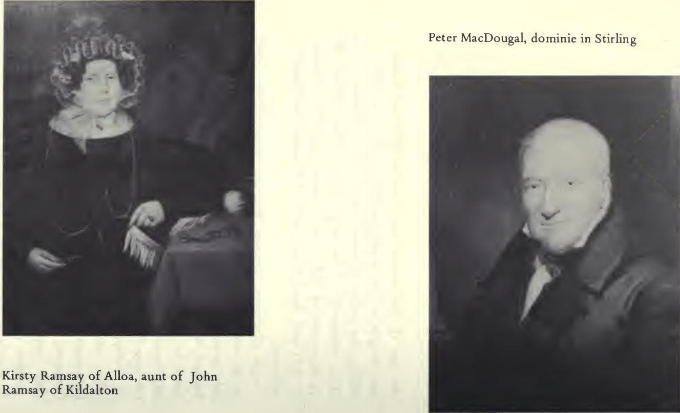 Aunt Christian Ramsay (known always in the family by the old Scots abbreviation of Kirsty) was a redoubtable woman, who had rescued the family finances when Robert, her eldest brother and father of Christian and John, let slip from his loose grasp the malting and distilling business built up by his father, Thomas Ramsay, and his grandfather Ebenezer Morrison. The Ramsays were an independent lot, possessed of flaring, though not sulky, tempers; proud of their lineage, descended from Dalhousie and kin to the Sterlings, Morrisons, Erskines, Grahams, Mitchells and Stems. Moreover, as a family they maintained a tradition of reform. In earlier generations they had "suffered" for the Reformed Church in Scotland and fought in the army of the Covenant; later, in 1747, they had followed the Reverend Ebenezer Erskine in the split of the Secession Church and later still, in 1843, they were to walk out of the General Assembly of the Church of Scotland with Dr. Thomas Chalmers to assist in the founding of the Free Church of Scotland.