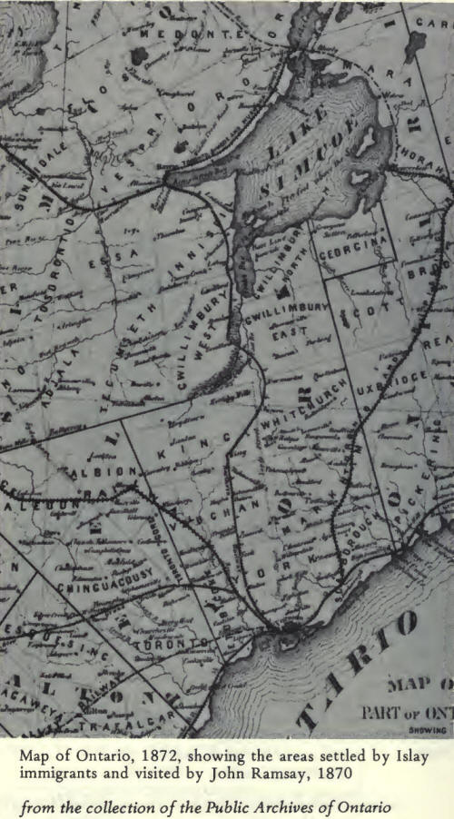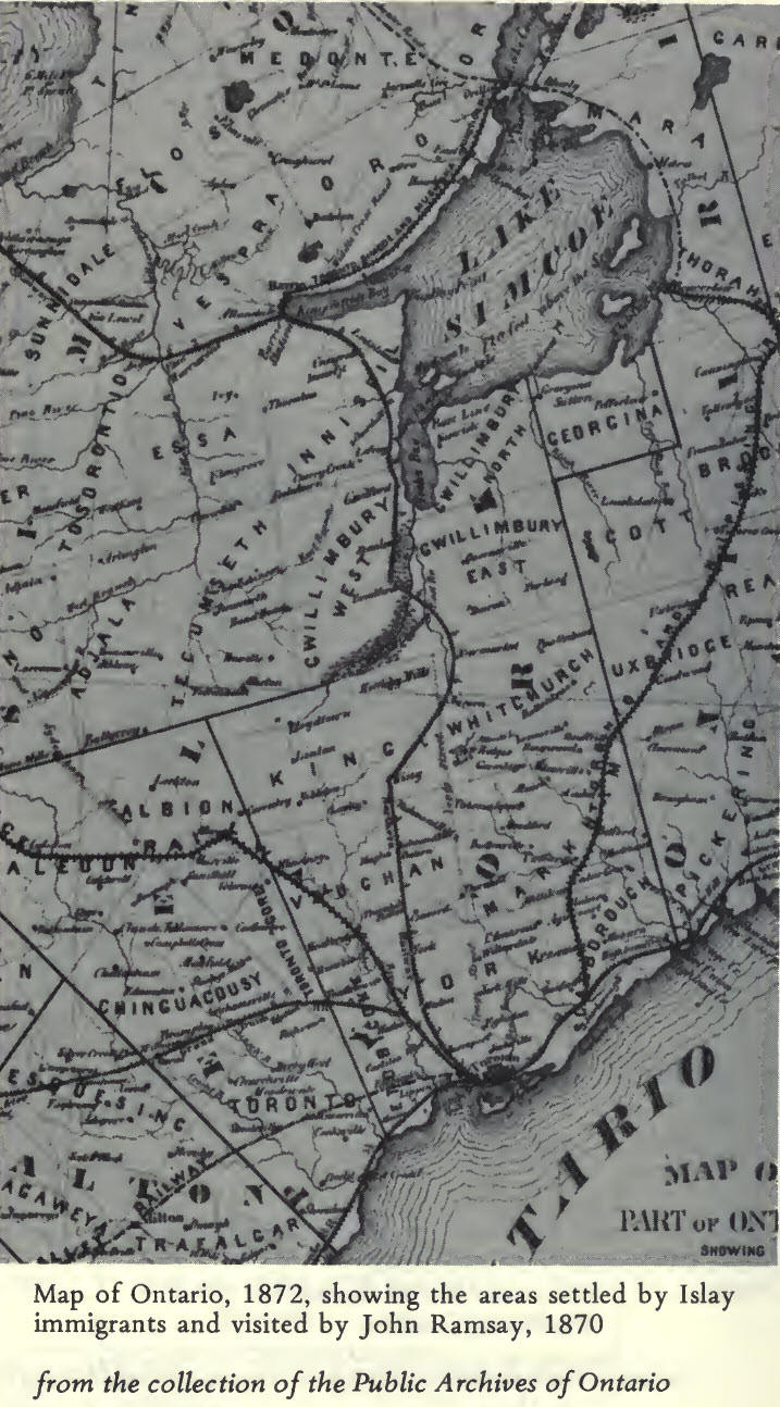 The Reverend John MacTavish, son of the parish minister and member of a family famous in the annals of Argyll and Canada, was minister at Woodville, Ontario, in the area in which so many Islay folk were to make their homes and where earlier emigrants of the thirties and forties had already settled. He was ready to help them on their arrival, not only with their spiritual needs but also with material necessities, particularly those lacking or with very little knowledge of English, who might so easily have fallen prey to adventurers.
