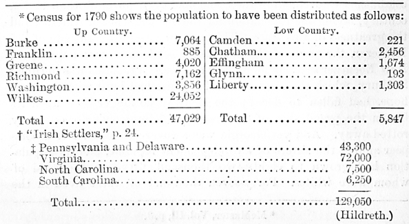 Whence came these people? Chiefly from the mountain and Piedmont regions of the Carolinas and Virginia. And whence came their ancestors? The answer to that question tells the part the Scotch and Irish have played in the settlement of Georgia. To answer it properly we must take a brief view of the conditions of the English colonies in America in 1689, the year after the revolution that placed William and Mary on the throne of England. Here and there along the seacoast from New England to South Carolina were scattered small settlements. The total white population of the entire country was only 180,000. Of these the Scotch and Irish had already contributed a part. Before that date, Froude says, began "that fatal emigration of nonconformist Protestants from Ireland to New England, which, enduring for more than a century, drained Ireland of its soundest Protestant blood, and assisted in raising beyond the Atlantic the power and the spirit which, by and by, paid England home for the madness which had driven them hither." From 1689 the emigration from the North of Ireland assumed important proportions. It is estimated that 100,000 emigrants left Ireland immediately after the revolution. Three thousand males left yearly for America. t And yet in 1702 the total white population of the colonies only reached 270,000; and in 1715, with this emigration from Ireland steadily going on, it only reached 375,000. At this latter date the total white population in Pennsylvania, Virginia, North Carolina, and South Carolina—the colonies in which the Scotch and Irish principally settled—was only 129,000.+