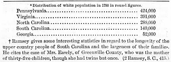 But it was not until some years later that the Scotch-Irish emigration reached its flood; coming, says Froude, from that character of people who were best calculated to make Ireland great, "the young, the courageous, the energetic, the earnest." "And the worst of it is," he adds, "that it carries off only Protestants, and reigns chiefly in the north." Froude speaks of this emigration as "an exodus," and it seemed destined to depopulate the North of Ireland. * Ships came crowded to Charleston and to Philadelphia. In 1729 5,655 Irish emigrants arrived at the port of Philadelphia, and only 267 English, 43 Scotch, and 343 Germans. Ramsey states that Ireland contributed most to the population of South Carolina; Williamson tells us that the larger portion of the population of North Carolina came from Ireland; and all historians agree that the great bulk of the Irish emigration went into Pennsylvania, and thence to Maryland, Virginia, and the South. This emigration continued for more than a century. And yet after a century of emigration and a century of growth, the white population of Pennsylvania, Virginia, the Carolinas, and Georgia was only 1,285,000. * These early settlers were vigorous and long-lived. Their families were large. They multiplied with rapidity. t A striking proof of this is found in the present population of the Southeast, to which there has been practically no foreign emigration for a century. In 1880 the white population of Georgia was 816,000, and 323,000 persons born in the state resided in other portions of the country. The increase in the Carolinas and Virginia and the number of persons contributed by them to other states is equally striking.