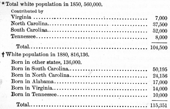 The great current of emigration from the Northeast to the Southwest left its deepest impression in Middle Georgia. In 1850 the bulk of the population in the state was between two lines: one drawn from a point on the Chattahoochee a little below Columbus, to Macon, and thence east to the Savannah River; the other from the Chattahoochee about West Point, along the lines of the Atlanta and West Point and the Atlanta and Charlotte roads to the Tugalo River. The same lines extended to the northeast would have included the majority of the population of the Carolinas. By this date three-fourths of the white population of the state was native born, but there was still a large emigration from Virginia and the Carolinas. Tennessee, too, had begun to add a goodly number. In 1850 there were 560,000 white people in the state. One hundred and nineteen thousand of them were born in other states. One hundred and four thousand of that number were contributed by the states just named * South Carolina, whose up country population was overwhelmingly Scotch-Irish, has nearly doubled every other state in the number of emigrants she has contributed to Georgia. t