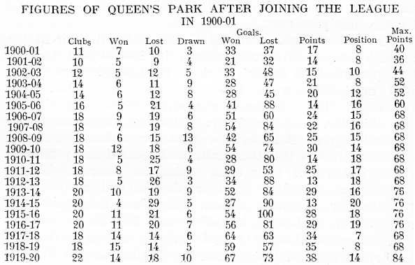 The Queen's Park, though never taking a prominent position on the League table, and sometimes indeed a very humble one, has always been retained in the "upper circle." It has a large following, and its battles with the other League clubs are watched with the keenest interest. It is one of the best drawing clubs in the League, and, though its position may be low at the end of the season, its defeats are often sustained by a very narrow majority of goals. To say that ii has more drawn games to its credit than any other League club is only to speak the truth. In season 1908-09 it had no fewer than thirteen such results, in 1911-12 ten, in 1903-04 and 1913-14 nine each, and in 1904-05 eight. As wins count two points each, and draws one, such results are not quite satisfactory.