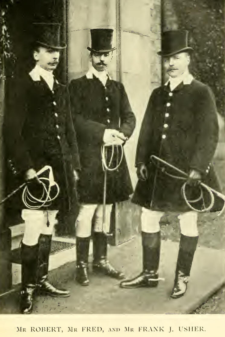 During the thirty years which terminated with the retirement of Mr Cross in 1895, no fewer than nine masters had come and gone, but none of these had remained in office so bug as Sir Robert Usher and his brothers who, even now when their joint rule was at an end, did not sever their connection with the Hunt. After their resignation both Mr Fred and Mr Frank Usher contributed to the Hunt funds—the former up to the time of his death in 1909 and the latter up to the present time,—while Sir Robert, again putting his shoulder to the wheel, resumed the position he had relinquished, and is master still.