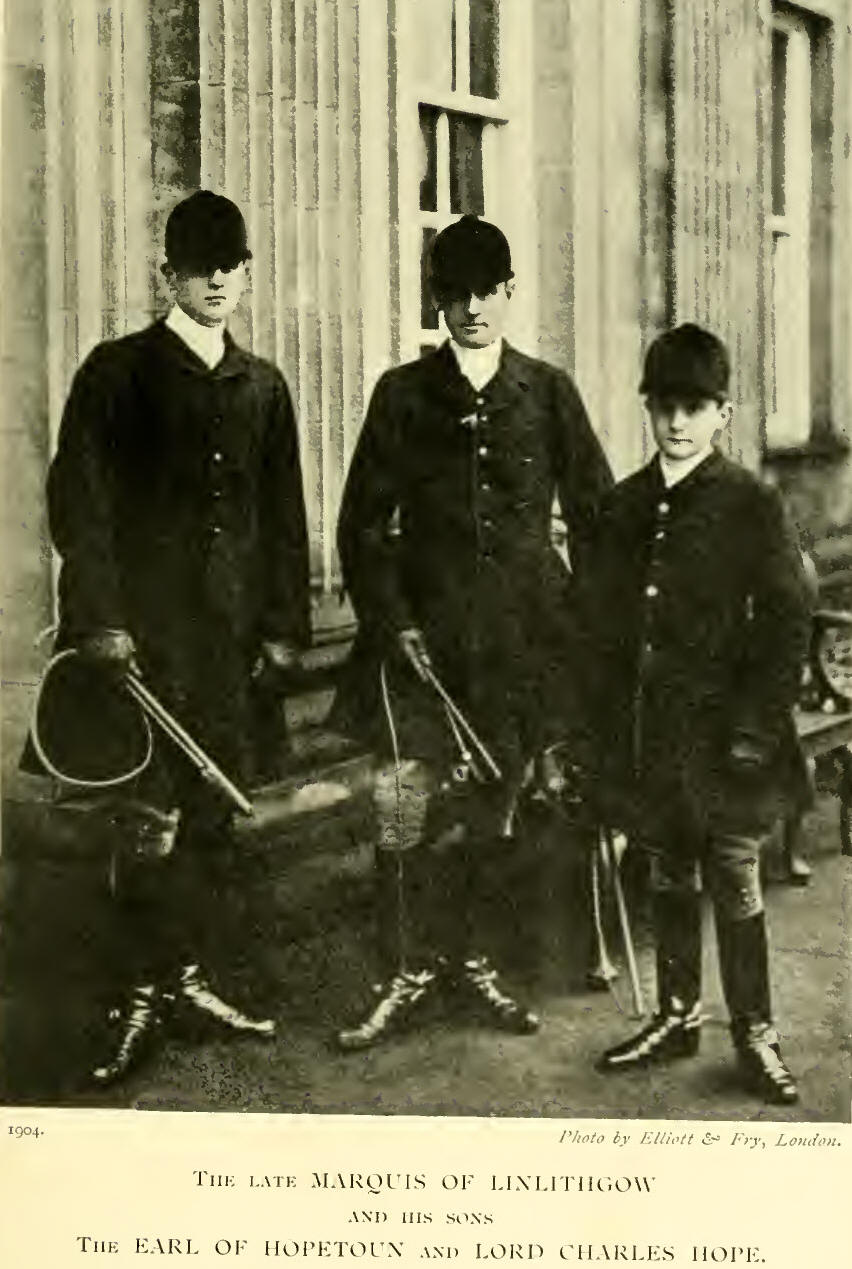 Regarding those, other than masters, who have supported the Hunt—since the beginning, most of the landowners in the country, whether they hunted or not, have given their aid or countenance to the sport in one way or another; the farmers, although but few of them have joined in the chase of late years, have cheerfully allowed their land to be ridden over ill worst periods of agricultural depression; and many more, neither owners nor occupiers of land, but followers of the pack, have afforded pecuniary assistance. To enumerate all the supporters whom the Hunt has, and has had, would form a difficult if not a well-nigh impossible task, but without invidious distinction, particular mention may be made of the Houstoun family and the Hopetoun family, for the former during several generations has given every assistance in its power, and the latter, notably, all through the Hunt's history, has contributed much support. Within recent years the Hunt has had no better friend than the late Marquis of Linlithgow, who, although keeping two private packs, the Hopetoun harriers and beagles, was always ready, as his son is now, to welcome the foxhounds upon his land. And although none of the main line of this family has ever accepted the control, there has probably never been a period at which a member of it would not have been gladly hailed as master, both by the subscribers and by the country.