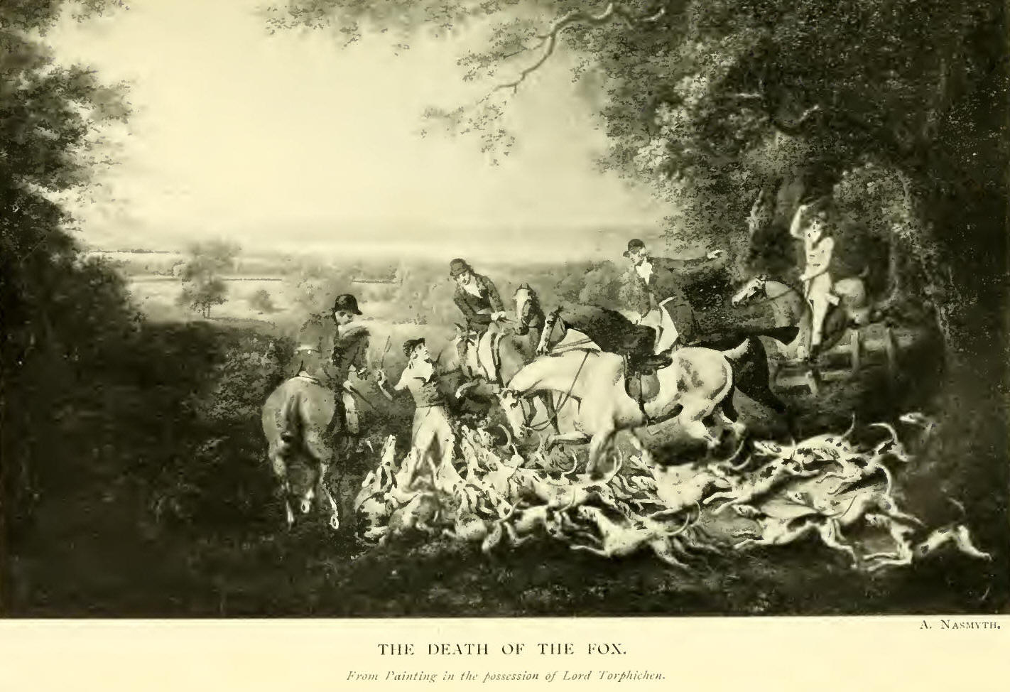 Turning again from the men - masters, supporters, and huntsmen—to the hounds, there is nothing to indicate where the original pack came from, or what was its strength in the Hunt's earliest days. The picture of "The Death of the Fox," however, painted by Alexander Nasmyth about the year 1795, gives some idea of the stamp of hound in use at that time. III the hounds seem to have been small, perhaps not more than twenty inches in height, deficient in bone and substance, light in colour, and resembling the harrier rather than the foxhound, but showing quality and having great neck and shoulder. The pictures of different dates in which the hounds are depicted form in themselves a sort of history of the latter, and it is interesting to compare one picture with another since each, assuming always that the drawing is correct, serves to illustrate the type of hound existing at the time, and to demonstrate the progress which has gradually taken place in hound breeding.