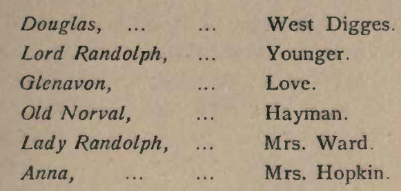 Its management, however, passed through a variety of hands. Dissensions arose amongst the performers themselves, factions were created, and the end was reached one evening when, during a performance of Hamlet, the auditors completed the tragedy of disaster by wrecking the theatre and setting it afire. A long spell of litigation followed; but at length the house was refitted, and, amongst the first items of importance that may be cited was the production of Douglas, by the Reverend John Home, minister of Athelstaneford, on 14th December, 1756. The cast included