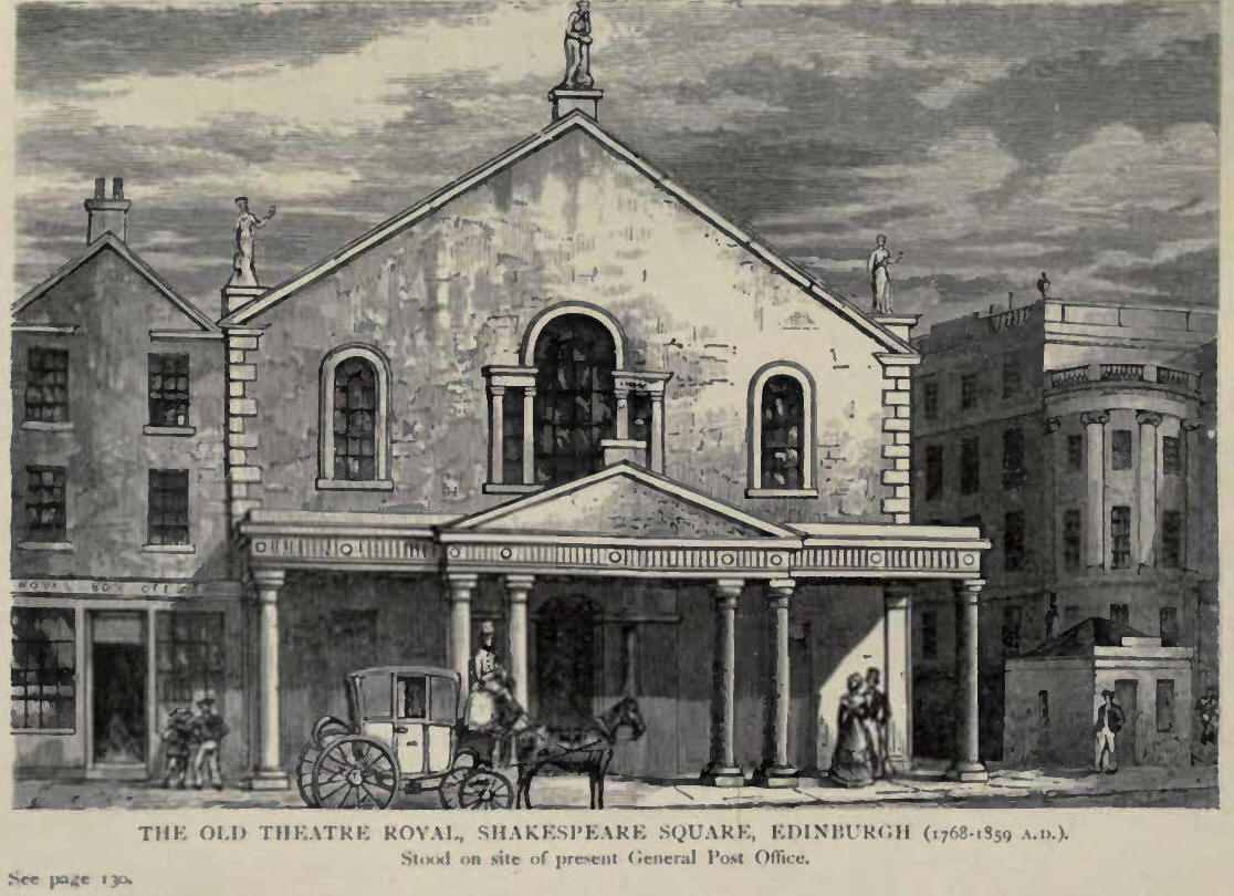 To the old Theatre Royal in Shakespeare Square many stars had come. Here Vandenhoff the elder (circa 1825) appeared as Sir Giles Overreach, and as Sir William Wallace in The Baffle of Falkirk; Denham, who played James VI. to Murray's "Jingling Geordie"; Mrs. Renaud, tragedienne; Mrs. Nicol as leading old lady; Miss Paton; and Miss Noel. The scene painter was David Roberts, and the leader of orchestra, T. Fraser.