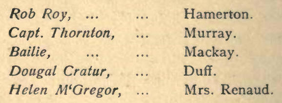 During the next three years, the stars who visited were the elder Mathews, Miss Stephens, Charles and Mrs. Kemble. Even those attractions were not sufficiently strong to keep the wolf from the door, for in 1819 we find a form of arrestment being put in by a number of clamorous creditors. The saving of the situation lay in the hands of Scott. Rob Roy had already attained a gratifying success at Covent Garden. An excellent cast was rehearsed, special scenery provided, and on the 15th February the opening night came. The result over-reached the most extravagant hopes, public opinion declaring it one of the greatest theatrical hits of the times, and indeed, in Scotland, it may still he regarded as such, if the testimony of perennial revivals be the ultimate criterion. The piece ran for forty-one nights, which, although apparently a short run according to modern experience, was considered a record in these days.