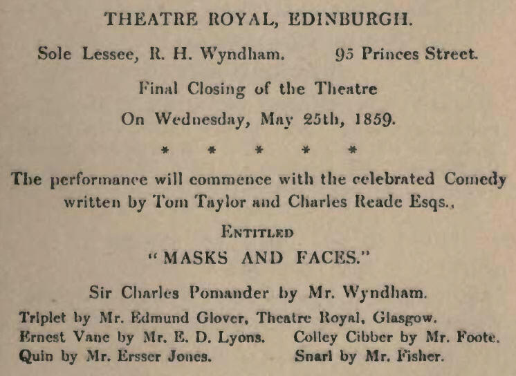 Her brother, William Murray, leased the house for another twenty-one years, retiring in 1851 after a period of indifferent success. Lloyd, the comedian, Robinson, and Leslie had a spell of management, but, failing to make the theatre a paying concern, it fell into the hands of R. H. Wyndham. The last-named, a gentleman by birth and education, came to Edinburgh in 1845 in support of Helen Faucit. He had previously managed the Adelphi, until its destruction in 1853, when he assumed the reins at the Theatre Royal, and under his able conduct it speedily became one of the best known houses in the three kingdoms. As an actor, he was at his best in light comedy. Mrs. Wyndham played with distinction such parts as Peg Woffington, Mrs. Haller, and Lady Macbeth.