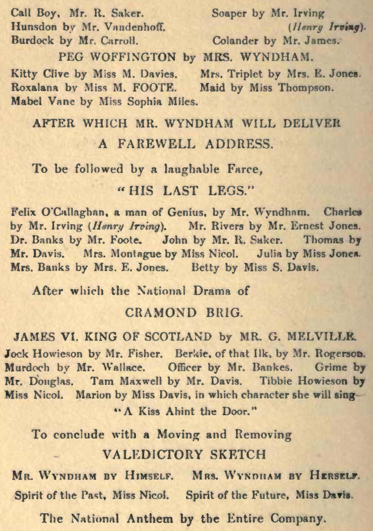One of the most notable items in this programme, to a dramatic student, is the appearance of young Henry Irving, then nineteen years of age. He had just migrated from the stock company at the Lyceum Theatre, Sunderland, and joined up Wyndham's stock company in Edinburgh, where, during his sojourn, he played the parts of Horatio, Banquo, Macduff, Catesby, Pisanio, and Claudius. He also appeared in burlesque and pantomime. The local critics praised him for his "gentlemanly" air, his earnest ways, and the care he bestowed on his make-up and costume, and occasionally chided him for some of those mannerisms which afterwards became historical.