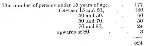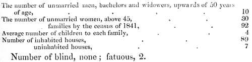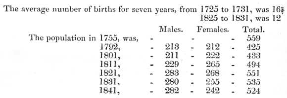 There exist no data by which the population of this parish at an early period can be fixed with accuracy. Were we, however, to form an estimate from the average number of births at two corresponding periods of the last and present century, we should be led to conclude that the population is considerably on the decrease.