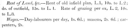 Husbandry.—The husbandry now almost universally adopted is of the most approved description, and many of the obstacles that formerly obstructed the progress of agriculture have yielded to the combined influence of skill, industry, and capital. The abolition of run-rig, or intermixed allotments of ground occupied by different tenants; the conversion of crooked and highly raised, into straight and moderately low riggs; the exclusion of surface water from low-lying fields; the efficient draining of marshy ground ; the removal of large surface stones, which were alike unseemly in appearance as detrimental to productiveness; the application of lime to reclaimed ground, or to dormant soil, which deep ploughings had brought into contact with manure; the introduction of early seed from the more genial southerly counties; the substitution of an improved breed of horses, for the puny and powerless animals, the native breed of the county; the exchange of the cumbrous and wasteful machinery of a twelve oxen plough, for the two horse plough, of a lighter construction; the general prevalence of drill-turnip husbandry; the adoption of the rotation of cropping best adapted for the respective soils ; the abolition of servitudes and mill-multures; these, under the auspices of practical knowledge, and of moderate capital, have conspired, in bringing the husbandry of the parish into no distant competition with the boasted agriculture of the finest counties. It is indeed impossible to subdue the obstacles arising from climate and local situation, and any attempt to raise wheat and barley often proves abortive, but the crops of bear and oats are not, in favourable seasons, exceeded very much in quantity or in weight in almost any part of Scotland. Enclosures are still much wanted, to enable the farmer to turn his fields to the best possible advantage. Very few farms have as yet the benefit of enclosures, though quarries for the purpose might be opened on almost every farm; and the tedious operation of the entail act of 10th Geo. III. presents an almost insuperable obstacle to this desirable species of improvement. To release property from the fetters of entail would be an act worthy of an enlightened legislature, or were its restrictions modified, liberal-minded landlords, without incurring the risk of personal responsibility, yet with permanent advantage to the property, could render meliorations for improvements, a burden upon succeeding heirs. It is, however, very gratifying to remark, that, though both estates in this parish are held under strict entail, the progress of agriculture has not, as yet, been retarded by its paralyzing influence. Every reasonable encouragement and accommodation are given by the respective proprietors, and the farm-buildings are neat and commodious, constructed of durable materials, agreeably to plans sanctioned by the proprietors. The expense of erecting farm-steadings and enclosures, is, in general, defrayed exclusively by the tenant, and he is entitled to remuneration only at the expiration of his lease. The duration of leases is for the usual period of nineteen years. Though this period may be happily chosen to meet a change of circumstances, it is by no means sufficient to afford any adequate remuneration for capital invested in extensive improvements.