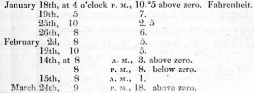 * The writer has not a self-registering thermometer, and may not have observed the lowest degree of temperature that occurred during this very severe storm. It is unnecessary to give the temperature of every day, but it is worthy of notice that the thermometer did not average higher titan 24° at 8 o'clock a. m. from the 15th January to the end of February. The following are some of the more excessive degrees of cold that were remarked, viz.:—