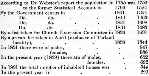 We have no account of the population of the parish previous to 1755, but, judging from the registers of births and marriages at the close of the seventeenth century, which at that period appear to have been very exactly kept, it had been much more populous than in recent times, the entries in any year then being greatly more numerous than now.