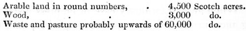 Previous to the alteration in the distillery laws, this parish was one of the strongholds of smuggling. The inhabitants of Corgarff, the glens, and not a few in the lower part of the parish, were professed smugglers. The revenue-officers were set at defiance. To be engaged in illicit distillation, and to defraud the excise, was neither looked on as a crime, nor considered as a disgrace. As may be supposed, such a system of things proved most pernicious, productive of the grossest demoralization, irreligion, and sin, and destructive of every habit of regular industry. But a happy change took place. By the vigorous measures adopted by Government, effectively seconded by the proprietors, this moral pest was struck at the very root, and speedily became utterly extinct. The lawless life of the smuggling "bothie" was wholly abandoned, and the honest labours of agriculture substituted. It is a subject of just congratulation, to contemplate the industrious spirit, the healthy tone of moral feeling, and the fixed religious principle that are gradually, under the blessing of God, acquiring more and more strength over their minds. IV.—Industry. Agriculture.—The number of acres cultivated and waste cannot be stated with precision, as several of the properties have not been surveyed. The most accurate approximation the writer has been able to arrive at is as follows, viz.