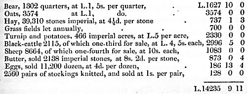 The ordinary food of the peasantry is oatmeal, vegetables, and the produce of the dairy. Fortunately for morality and good order, the "bothy" system for servants is scarcely known in the parish. In some cases the men have their meal and milk, which is prepared in the kitchen.