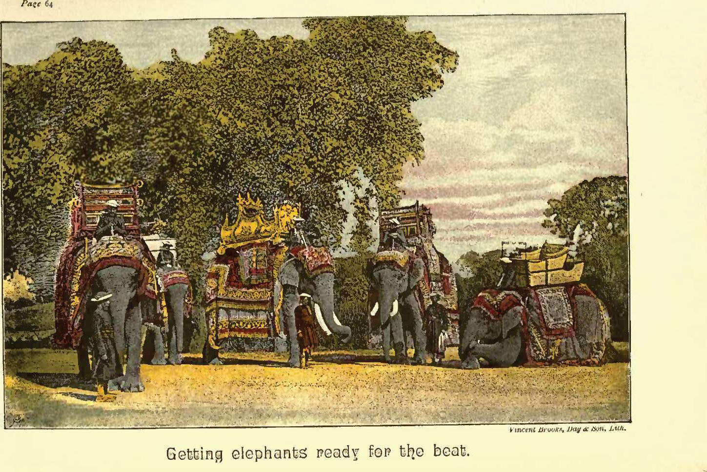 The "Barce" as such a jungle is termed, resounded with the shouts, oaths, and cries of the excited beaters. The deafening clatter of several tom-toms, the occasional shrill trumpeting of an impatient hathee (elephant), as a tough prickly creeper would trail a scar across his trunk, and the indescribable mingled medley of crashing sound, which always accompanies a beat in the jungle by elephants, formed welcome music in our ears.